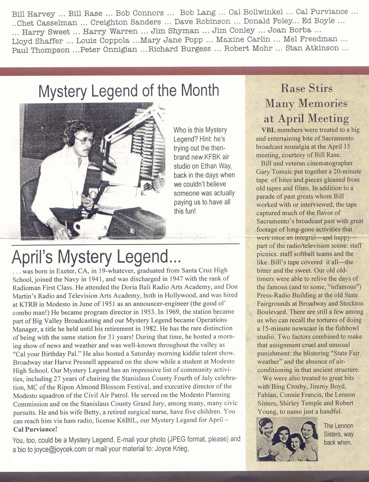 | HOME A/V Bios & History Contact Us Links Meetings/Events Membership Info JOIN! Newsletters Signed-Off |